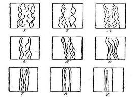 При повышении градиента скорости у растворов полиакрилонитрильных полимеров появляется эффект неустойчивого течения. В результате вытекающий раствор сначала получает колебательное движение, а затем начинает извиваться [6]. Форма струйки прядильного раствора полиакрилонитрила в диметилформамиде, вытекающего из капилляра при разных условиях течения приведена на рис.4.