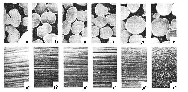 Рис.6. Электронно-микроскопические снимки формы поперечного сечения (а–е) при увеличении в 2500 раз и морфологии поверхности (а’–е’) при увеличении в 10000 ПАН волокон, сформованных в осадительную ванну с различным содержанием ДМФА (в %: а, а’ – 45; б, б’ – 63; в, в’ – 70; г, г’ – 75; д, д’ – 82; е, е’ – 85)