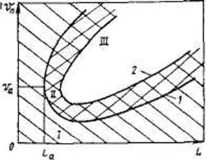При визуальном наблюдении процесса формования струи раствора ПАН в ДМФА установлено, что существует три области (рис.7), соответствующие различным условиям формования. Область I соответствует устойчивому формованию, область II - резонансу вытягивания, область III- неформуемости струи. Кривая Iявляется границей устойчивости, в областях II и III развивается резонанс, который по мере увеличения амплитуды колебаний диаметра струи наряду с другими причинами приводит к обрыву струи (кривая 2на рис.7 есть граница обрыва струи, но не граница исчезновения резонанса).