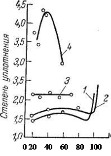 Рис.8. Зависимость степени уплотнения полиакрилонитрильного волокна от растворителя в осадительной ванне: 1 – диметилформамид; 2 – диметилсульфоксид; 3 – 51%-ный раствор роданида натрия; 4 - 85%-ный раствор этиленкарбоната