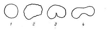 Рис.10 Форма поперечных срезов ПАН волокон, сформованных в различных условиях: а – в мягких условиях; 2 – в более жестких условиях; 3 – в жестких условиях; 4 – по сухому методу