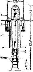 Рис.11. Схема прядильной машины для формования полиакрилонитрильного волокна сухим методом: 1 - обогреваемый блок е дозирующими насосами; 2 - фильера; 3 - обогреваемая шахта; 4 - приемные диски; 5 -место отсоса газопаровой смеси |