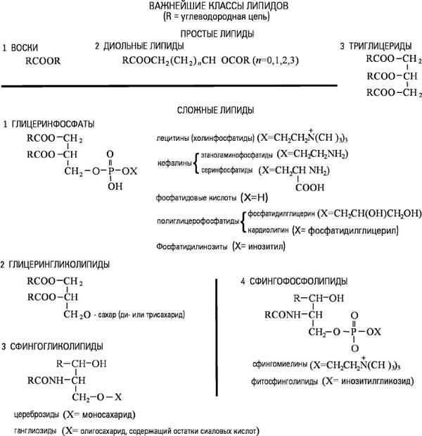 Большинство Л. — производные высших жирных кислот, спиртов или альдегидов. В зависимости от химического состава Л. подразделяют на несколько классов (см. схему). Простые Л. включают вещества, молекулы которых состоят только ив остатков жирных кислот (или альдегидов) и спиртов, к ним относятся жиры (триглицериды и др. нейтральные глицериды), воски (эфиры жирных кислот и жирных спиртов) и диольные Л. (эфиры жирных кислот и этиленгликоля или др. двухатомных спиртов). Сложные Л. включают производные ортофосфорной кислоты (фосфолипиды ) и Л., содержащие остатки сахаров (гликолипиды ). Молекулы сложных Л. содержат также остатки многоатомных спиртов — глицерина (глицеринфосфатиды) или сфингозина (сфинголипиды). К фосфатидам относятся лецитины, кефалины, полиглицерофосфатиды, фосфатидилинозит, сфингомиелины и др.; к гликолипидам — гликозилдиглицериды, цереброзиды, ганглиозиды (сфинголипиды, содержащие остатки сиаловых кислот). К Л. относят также некоторые вещества, не являющиеся производными жирных кислот, — стерины , убихиноны , некоторые терпены . Химические и физические свойства Л. определяются наличием в их молекулах как полярных группировок ( —COOH, —OH, —NH2 и др.), так и неполярных углеводородных цепей. Благодаря такому строению большинство Л. является поверхностно-активными веществами, умеренно растворимыми в неполярных растворителях (петролейном эфире, бензоле и др.) и очень мало растворимыми в воде.