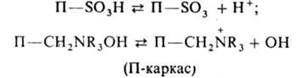 Ионообменные смолы имеют каркас, состоящий из высокополимерной пространственной сетки углеводородных цепей, в которых закреплены фиксированные ионы. Иониты представляют собой трехмерные полимерные или кристаллические сетки, несущие ионогенные группы. Ионогенные группы состоят из прочно связанных с сеткой фиксированных ионов и способных к обмену противоионов, заряд которых противоположен по знаку заряду фиксированных ионов (рисунок 1) .