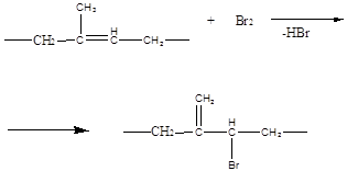 В отличие от хлора бром при взаимодействии с бутилкаучуком более склонен к реакциям присоединения. Однако при проведении процесса в контролируемых условиях удаётся вводить до 90% брома в аллильное положение: