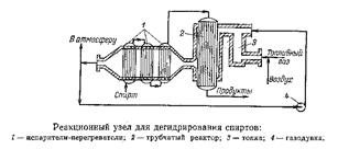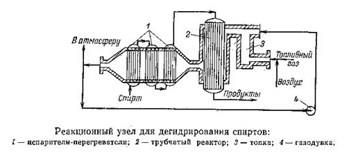 Значительная эндотермичность дегидрирования обусловливает применение трубчатых реакторов, в межтрубном пространств которых циркулируют горячие газы от сжигания газообразного или жидкого топлива. Схема типичного реакционного узла дл дегидрирования спиртов представлена ниже. В топке З происходит сгорание топливного газа, подаваемого вместе с воздухом через специальные форсунки. Температура топочных газов слишком высока, поэтому их разбавляют обратным газом (циркуляция его в системе осуществляется газодувкой 4). Спирт поступает вначале в систему испарителей-перегревателей 1, где он нагревается до нужной температуры частично охлажденными топочными газами. Затем пары спирта попадают в реактор 2, где в трубе находится катализатор. Реакционная смесь подогревается горючими топочными газами, находящимися в межтрубном пространстве, что компенсирует поглощение тепла из-за эндотермичности процесса. По выходе из контактного аппарата реакционные га охлаждают в холодильнике-конденсаторе (на рисунке не показан), а в случае летучих продуктов их дополнительно улавливают водой. Полученный конденсат (и водные растворы) ректифицируют, выделяя целевой продукт и непрореагировавший спирт, возвращаемый на дегидрирование.