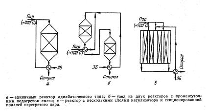 Они работают в адиабатических условиях, и реакционная смесь постепенно охлаждается, причем водяной пар играет здесь и роль аккумулятора тепла, не давая смеси чрезмерно охладиться. При получении стирола в единичном адиабатическом реакторе обычная степень конверсии этилбензола составляет около 40%. Недостатки такого единичного реактора – существенное охлаждение смеси, одновременное смещение равновесия в нежелательную сторону и зависящее от этого снижение скорости и селективности. Степень конверсии нельзя довести до приемлемой величины, т.к. это повышает удельный расход пара. Другие установки (рис.Б) приближают процесс к изотермическому и лучше учитывают особенности равновесия реакции. В такой установке имеются 2 реактора (или два слоя катализатора). Охладившуюся в первом реакторе смесь до подачи во второй реактор нагревают перегретым паром. Реактор на рисунке В имеет два-три кольцевых слоя катализатора, причем в первый слой поступает весь этилбензол, но лишь часть водяного пара. В пространство между слоями катализатора подают дополнительное количество перегретого пара. С его помощью повышается температура смеси и происходит ступенчатое разбавление смеси с удалением ее от равновесного состояния, что способствует росту скорости и селективности реакции.