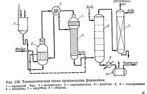 Технологическая схема производства формальдегида окислительным дегидрированием метанола изображена на рис. 139. Метанол, содержащий 10-12% воды, из напорного бака 1 непрерывно поступает в испаритель 2. Туда же через распределительное устройство подают воздух, очищенный от пыли и других загрязнений. Воздух барботирует через слой водного метанола в нижней части испарителя и насыщается его парами. В 1 л образующейся паро-воздушной смеси должно содержаться 0,5 г метанола. Поддержание такого состава смеси очень важно для обеспечения взрывобезопасности и нормального протекания процесса. Поэтому работа испарительной системы полностью автоматизирована: поддерживают постоянные уровень жидкости в испарителе, ее температуру (48—50°С) и скорость подачи воздуха, благодаря чему обеспечиваются необходимые температурный режим и степень конверсии в адиабатическом реакторе.