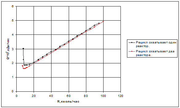 Таким образом, в данной работе рассматриваются две схемы с различной подачей рецикла с позиции минимальных энергетических затрат, необходимых для достижения заданной конверсии и селективности.