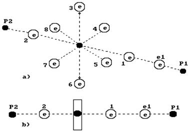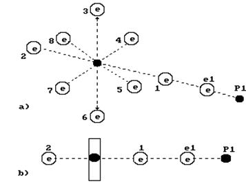 b) линейная схема 1,2,3,4,5,6,7,8 - номера электронов атома кислорода;