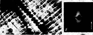 На рис.1 представлены электронно-микроскопический снимок (а) и малоугловая фоторентгенограмма (б) ориентированной неотожженной композиции К1. Микродифракцией установлено, что темные "бусинкоподобные" ряды являются диспергированными частицами ПЭ в матрице ПП (более светлые области). Система представляет собой ламелярный кристалл, о чем свидетельствует каплеобразная форма рефлексов на меридиане малоугловой рентгенограммы. Оценка периодичности показала, что большой период превышает 50 нм и совпадает для обоих компонентов. Толщина образований ПЭ, имеющих резко анизодиметричную форму, порядка 200 нм. Размер "бусинки" вдоль оси ориентации, определяемый по морфологической картине, составляет 80 нм, что хорошо коррелирует с величиной большого периода, определенной по рентгеновским данным.