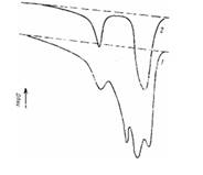 Типичные ДСК-термограммы композиций К1 и К2 при нагревании приведены на рис.2. В первом случае картина имеет сложный характер и содержит четыре хорошо выраженных максимума. Первый пик локализован при 402 К, последний при 443 К, что соответствует плавлению ПЭ и ПП в "обычной" механической смеси К2 . Происхождение двух других максимумов проанализировано в работах [1-3], в которых установлено, что при 424 К происходит фазовый переход ПЭ из орторомбической в псевдогексагональную модификацию, а при 433 К - плавление псевдогексагональной мезофазы ПЭ.