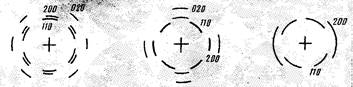 Как можно видеть, основное отличие данной дифракционной картины от обычно получаемой для С-текстуры (набор колец равномерной интенсивности, концентрических относительно центра рентгенограммы) заключается в существенном сгущении интенсивности по дугам, расположенным вблизи меридиана (рефлексы (110)) и экватора (рефлексы (200)). Угловая ширина дуг по азимуту примерно одинакова для обоих рефлексов и составляет ~45°. Такой характер рентгенограммы можно объяснить сплюснутостью вдоль нормали к плоскости пленки морфологической единицы (полости), причем структурные элементы такого образования должны располагаться так, что большинство кристаллов ориентировано осью "а" перпендикулярно плоскости пленки-образца. Отметим, что и в данном случае приходится констатировать, что ось "с" направлена преимущественно вдоль рентгеновского пучка, что в сочетании с первыми двумя случаями указывает на наличие симметрии, близкой к сферической.