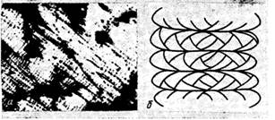 Анализ показывает, что при боковой съемке получается дифракционная картина от семейства кристаллов, ось "а" которых направлена вдоль экватора, т.е. перпендикулярно оси вытяжки и плоскости пленки, а ось "в" - вдоль меридиана, т.е. параллельно этой оси.