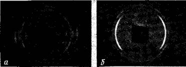 При этом следует отметить, что частично все три рефлекса сохранились па экваторе, а частично образовали дебаевские кольца, что соответствует наличию в системе некоторой доли кристаллов с С-текстурой, с одной стороны, и изотропного материала - с другой.