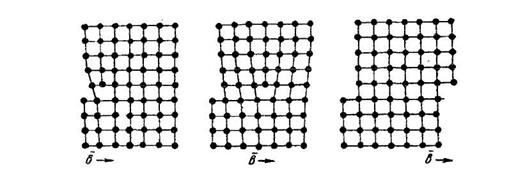 Дислокації можуть виникнути, наприклад, при механічному навантаженні кристала. На мал. 10.11 показане утворення крайової дислокації при механічному зрушенні верхньої частини ґрати (мал. 10.11, а). При впливі здвигової напруги дислокація переміщається через кристал (мал. 10.11, б) і, зрештою, виходить на його поверхню мал. 10.11, в). При цьому на поверхні виникає елементарна сходинка, висота якої відповідає величині вектора Бюргерса. Залежно від числа дислокацій, що пересунулися, в одній площині ковзання виникаючий щабель ковзання може бути кратний елементарного щабля.