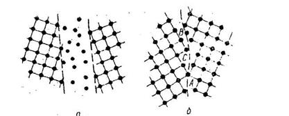 Рис. 10.16. Моделі границі зерен (по Фріделю): а - шар Бейлбі; б - реальна границя