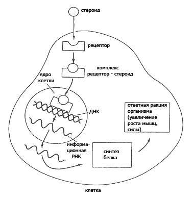 Нормально функционирующий организм пытается балансировать между этими двумя процессами, выполняя постоянное обновление и замену тканей. Баланс можно оценить по балансу азота в организме Из словаря Stedman's Medical Dictionary: [Азотистый баланс - это] разница между общим количеством азота, организмом употребленным и количеством азота, организмом выделенным. У взрослого, уже не растущего организма, этот баланс должен быть около нуля или немного выше. Анаболические стероиды уменьшают катаболический эффект, увеличивая выработку протеина в мышцах. Считается, что они (АС) проникают внутрь клетки и занимают свободные андрогенные рецепторы. Вновь образованный комплекс стероид-рецептор продвигается к ядру, взимодействует с РНК и вызывает копирование (? transcription).