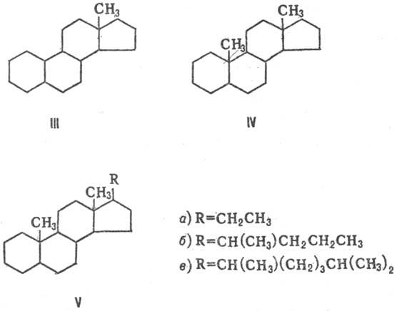В зависимости от структуры боковой цепи и наличия групп СН3 различают производные эстрана (ф-ла III), андростана (IV), прегнана (Vа), холана (Vб) и холестана (Vв).