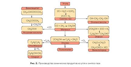 Ведутся исследования по разработке технологии производства метанола, которая позволит многие важнейшие продукты, производимые из нефтяного бензина через этилен (рис. 1), получать непосредственно из синтез-газа или через метанол (рис. 2, 3). Это открывает возможность развития промышленности органического синтеза на основе альтернативного нефти сырья - угля и природного газа. Такая возможность существовала и раньше, поскольку процессы газификации угля и конверсии метана в синтез-газ давно применяются в промышленной химии. Однако низкий уровень техники и технологии ограничивал это направление химического превращения угля и природного газа лишь производством аммиака и метанола.