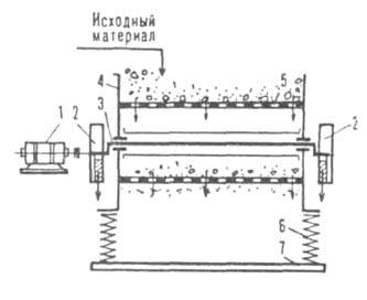 Рис. 1. Наклонный инерционный грохот с мех. вибратором: 1-электродвигатель; 2-шкивы с дебалансом; 3-вал с подшипниками; 4 -короб; 5 - рабочая поверхность (напр., решето); 6-упругая опора; 7-опорная плита.