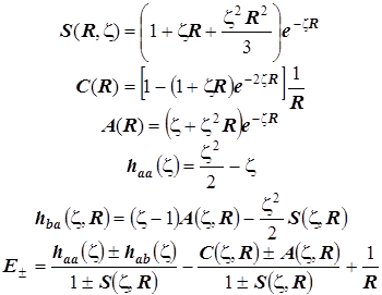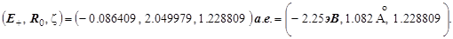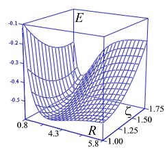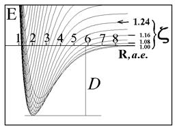 отвечают абсолютному минимуму целевой функции - полной энергии связывающей МО, определяемой в зависимости от двух переменных: межъядерного расстояния и эффективного заряда ядра - показателя экспоненты в формуле базисной АО. Энергетические уровни передаются формулой, на первый взгляд того же вида, что и в расчётах с одним варьируемым параметромR