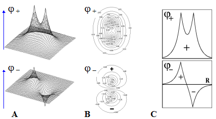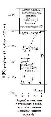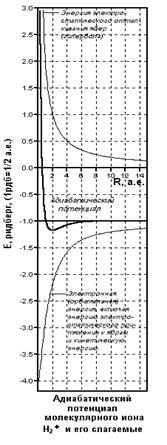 Применяя графические процессоры для современных персональных компьютеров (MATHCAD PLUS/PENTIUM 2,3,4), можно проиллюстрировать все вычисления. Наглядные пространственные графики на рис. изображают адиабатические потенциалы основного и первого разрыхляющего одноэлектронных уровней E ± (z,R ).