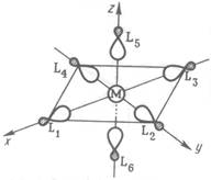Рассмотрим вначале наиболее простой, но весьма распространенный случай комплексов, образуемых лигандами L типа (СН3 )3 Р, NH3 , H2 O, ОН- , Н- , которые используют для связывания с центральным атомом металла неподеленную гибридную пару электронов или пару электронов на s-орбитали (гибрид-ион). Начнем рассмотрение с наиболее характерного типа координации — октаэдрического. Координационные связи в комплексе МL6 k+ , где М — переходный металл, образуются при донировании электронов с сигма- орбиталей лигандов на вакантные 3d-, 4s-, 4p- орбитали металла (возьмем атом металла третьего периода). Чтобы рассчитать валентные МО комплекса, выберем координатные оси, как показано на рис. 1, расположив вдоль них лиганды.