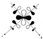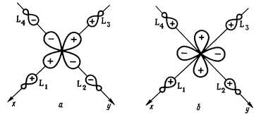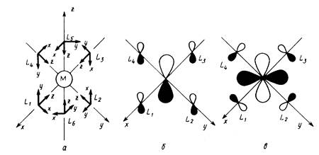 Полный базис валентных АО состоит из 15 орбиталей: девяти — металла, шести — лигандов. Только такие комбинации лигандных АО будут обобщаться в форме МО с различными орбиталями металла, которые преобразуются по одинаковым представлениям симметрии в точечной группе ОА . Нетрудно подобрать соответствующие комбинации сигма-АО лигандов (называемые групповыми орбиталями). Рис. 2,аиллюстрирует выбор групповой орбитали еg -симметрии, комбинирующейся с dx 2 - y 2 - орбиталью металла. Из рис. 2,бясно, почему любая комбинация сигма-АОлигандов дает нулевое перекрывание с rf-орбиталями металла типа t2 g .