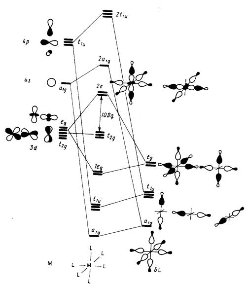 На рис. 3 дана корреляционная диаграмма МО октаэдрического комплекса. Она строится исходя из правил качественной теории МО. Имеются также многочисленные прямые расчеты электронного строения разнообразных комплексов МL6 k+ , выполненные в различных вариантах приближений, которые дают согласующуюся с диаграммой картину энергетических уровней.