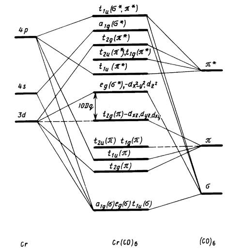 Для большей ясности сигма-орбитали различных типов (рис. 3) представляются в виде одного общего уровня. Расщепления, вызываемые взаимодействиями АО металла с пи-орбиталями лигандов, которые можно скомбинировать в групповые орбитали, пользуясь правилами теории групп, сравнительно малы. Как и в случае лигандов с р-орбиталями, можно рассматривать эти взаимодействия (за исключением t2 g -пи-взаимодействия) как второстепенные по сравнению с взаимодействиями d-сигма типа. В то же время эффект примешивания пи*-орбиталей лиганда к орбиталям металла t2 g -ряда играет важную роль, он приводит к увеличению расщепления t2 g —е g - уровней. Шесть СО-групп гексакарбонила хрома вносят 12 электронов неподеленных электронных пар, 24 пи-электрона, а атом хрома дает шесть электронов, т. е. всего имеется 42 электрона, заполняющих 21 связывающие МО (рис. 6).