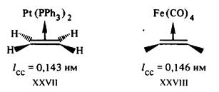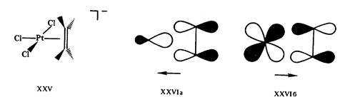 Природа связи в соли Цейзе XXV объясняется так называемой синергической моделью Дьюара—Чатта—Дункансона (1953), близкой по своей основной идее к описанию связывания в гексакар-бониле хрома (рис.7). Электронная плотность с высшей заполненной пи-МО этилена переносится на вакантную (spn )орбиталь металла (прямое донирование XXVIa). Упрочнение связи достигается также за счет эффекта обратного донирования (дативной связи) — частичного переноса электронов с заполненной d-орбитали металла на вакантную пи*-МО этилена. Строгие расчеты хорошо согласуются с общей схемой XXVI формирования связи в пи-комплексе XXV и других подобных ему структурах. Отвлечение электронной плотности со связывающей и частичное заселение антисвязывающей орбиталей этиленового фрагмента в XXV должно приводить к разрыхлению связи С = С в комплексе. Действительно, если частота валентного колебания этой связи в молекуле этилена равна 1623 см-1 , а длина связи 0,1337 нм, то в соли Цейзе частота колебания связи понижается до 1511 см-1 , а длина связи возрастает до 0,1354 нм.