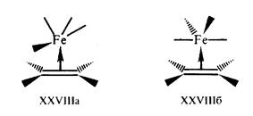 Еще более значительные изменения происходят в этиленовых тг-комплексах (рис.8.). Учитывая типы взаимодействий XXVIa,б, определяющих связывание в пи-комплексах, можно подойти к решению вопроса о конформационной предпочтительности пи-комплексов. Например, для железокарбонильного комплекса XXVIII можно представить две альтернативные конформации, учитывая бисфеноидную геометрию фрагмента Fe (CO)4 и предпочтительность экваториального положения алкена (рис. 9.):