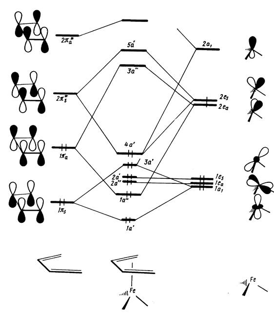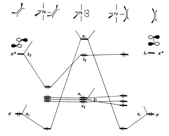 Можно видеть, что взаимодействия, реализующие связь металл—лиганд, отвечают схеме Дьюара—Чатта—Дункансона. Однако оба типа связывающих эффектов — прямое и обратное донирование — возможны только в конформации XXVIIIa, тогда как в конформации XXVIII6, отличающейся поворотом одного из фрагментов в экваториальной плоскости на 90°, исчезает d-пи* -перекрывание. Это приводит к отсутствию обратного донирования, ослабляет связывание и дестабилизирует конформацию XXVIII6. По данным спектроскопии ЯМР, энергетический барьер для вращения фрагмента Fe (CO)4 в XXVIIIa, связанный с прохождением через XXVIIIб, составляет 42—65 кДж/моль.