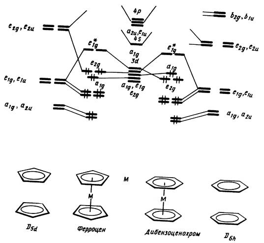 На рис. 13 показаны происхождение и последовательность валентных энергетических уровней в ферроцене XXXIII (M = Fe), а также в дибензолхроме XXXIV (М = Сг), получаемые на основании теории орбитальных взаимодействий и подтвержденные данными многочисленных полу эмпирических и неэмпирических расчетов.