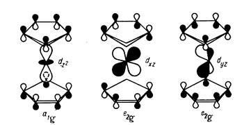 Восемнадцать валентных электронов ферроцена (восемь от центрального атома d6 s2 ) заполняют все нижние уровни вплоть до е2 g . Связи между металлом и кольцами обусловливаются МО а1 g и е1 g . Вид некоторых МО ферроцена показан на рис. 14.