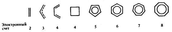 с р— d-донорным эффектом (Сl- , ОН- ), и сигма-лиганды с d-пи* -акцепторными свойствами (СО, CNR, CR2 , NO+ ). Кроме того, пи-лиганды рассматриваются аналогичным образом как льюисовские основания, причем число вносимых ими электронов приравнивается к числу электронов на связывающих и несвязывающих пи-МО. Это число можно оценить согласно рис.15.