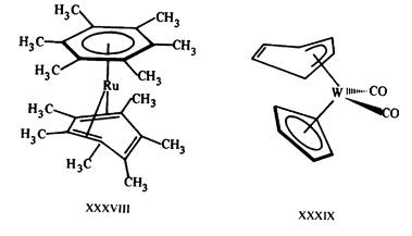 Нетрудно проверить выполнение правила 18 электронов для большинства рассмотренных выше пи-комплексов, например ферроцена (M = Fe), хромоцена (М = Сг). В отличие от последнего в валентной оболочке рутеноцена в структуре D6h -симметрик (M = Ru) содержалось бы не 18, а 20 электронов (Ru — d6 s2 , 8 электронов и по 6 электронов от каждого бензольного кольца). Чтобы иметь в валентной оболочке 18 электронов, структура рутеноцена должна быть искажена таким образом, чтобы одно из бензольных колец участвовало в связывании лишь двумя пи-связями. Именно такая структура XXXVIII найдена для перметильного производного рутеноцена (рис. 16). В отличие от неполярного симметричного хромоцена IX молекула XXXVIII характеризуется достаточно высоким дипольным моментом 2,03 D в растворе. Другой аналогичный пример — искажение пятичленного циклопентадиенового кольца в сэндвичевом вольфрамдикар-бонильном комплексе XXXIX (рис. 16), позволяющее вывести одну пи-связь (два электрона) из общего связывания. Атом вольфрама вносит шесть, два карбонильных лиганда — четыре, плоский циклопен-тадиенильный фрагмент — пять, а деформированный — три электрона.