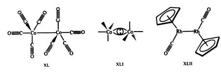 Необычная структура карбонила кобальта Со2 (СО)8 также объясняется тем, что в ней достигается 18-электронная конфигурация валентной оболочки. Мостиковые карбонильные группы образуют многоцентровые связи, при формальном рассмотрении они отдают по одному электрону на оболочку каждого атома кобальта. Диамагнетизм Со2 (СО)8 свидетельствует о спаривании электронов кобальта и образовании связи Со—Со. Действительно, расстояние Со—Со составляет, по данным рентгеноструктурных исследований, всего 0,25 нм. Аналогичным образом, в комплексе XJLII следует ожидать наличия двойной связи Rh=Rh (рис. 17).