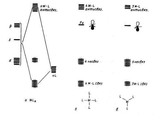 Это правило можно трактовать как стремление центрального атома металла иметь замкнутую электронную оболочку соответствующего атома инертного газа. Можно представить и другое общее объяснение, позволяющее одновременно предсказать важные исключения из данного правила. На рис. 18,априведена обобщенная диаграмма орбитальных взаимодействий валентных р-, s-, d-орбиталей (общее число которых равно 9) с n симметризованными сигма-орбиталями лигандов L в комплексе MLn . Подходящие по симметрии n-орбитали центрального атома (можно рассматривать их как соответствующие dx sy pz -гибридные орбитали) образуют с орбиталями лиганда nсвязывающих и n антисвязывающих МО, а (9 — n) d-орбиталей металла, имеющих отличную симметрию, образуют несвязывающий уровень. Очевидно, что на связывающих и несвязывающих уровнях можно разместить 18 электронов.