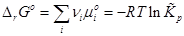 Стандартное сродство (стандартное приращение энергии Гиббса) определяется через стандартные химические потенциалы реагентов и продуктов и изотермой Вант-Гоффа связано с безразмерной термодинамической константой равновесия Kp: