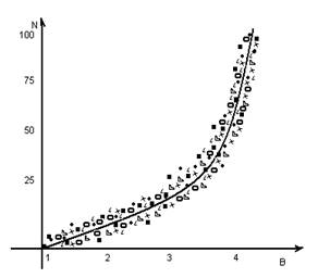 Практически все известные экспериментальные опухоли на начальной стадии растут по экспоненциальному закону. На рисунке приведены данные о кинетике развития 5 перевиваемых опухолей разного происхождения и локализации: