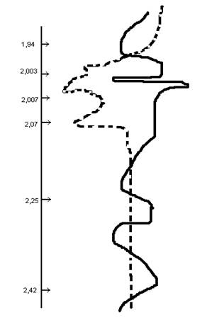 Парамагнитные частицы – свободные радикалы и комплексы ионов переходных металлов в парамагнитной форме – обнаружены в настоящее время во многих тканях животных и растительных организмов при их нормальном функционировании. Они регистрируются методом электронного парамагнитного резонанса (ЭПР). На рисунке показан характерный спектр ЭРП клеток печени. Каждый сигнал в спектре характеризирует так называемого g-фактор.Спектр ЭРП заторможенной ткани печени крыс (сплошной линией) и опухоли печени (пунктир).