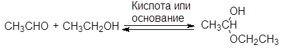 Спирты обратимо присоединяются к альдегидам с образованием полуацеталей. В спиртовых растворах альдегидов полуацетали находятся в равновесии с карбонильными соединениями. Так, в этанольном растворе ацетальдегида содержится около 30% полуацеталя (в расчете на альдегид).