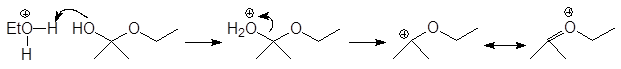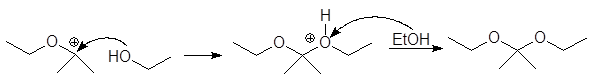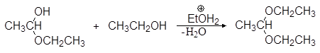 Полуацетали при взаимодействии со второй молекулой спирта в присутствии сильных кислот и при условии удаления воды в результате реакции нуклеофильного замещения могут превращаться в полные ацетали.