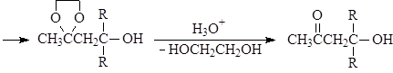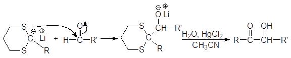 Результатом всех этих превращений является превращение альдегида в кетон. Литиевая соль 1,3-дитиана реагирует и с альдегидами, давая в конечном итоге a-оксикетон.