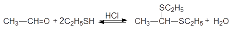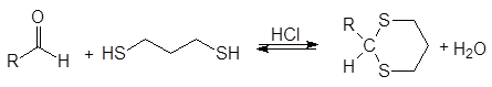 Атом серы тиолов является лучшим нуклеофилов, чем атом кислорода спиртов. Тиолы реагируют с карбонильными соединениями в кислой среде, образуя дитиоацетали.