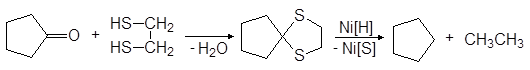 При нагревании тиокеталей с никелем Ренея в спирте происходит десульфурирование, в результате чего исходная карбонильная группа превращается в метиленовую и таким образом достигается восстановление альдегидов и кетонов в углеводороды.