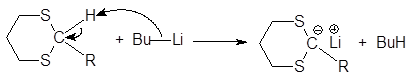 Дитиоацетали обладают СН-кислотными свойствами (pKa31), поэтому при действии сильных оснований, например, литийорганических соединений, они отщепляют протон, образуя карбанион, отрицательный заряд которого делокализуется при участии 3d-орбиталей атома серы. В результате происходит обращение полярности реакционного центра (Umpolung): карбонильный атом углерода (электрофильный центр) превращается в карбанион, обладающий нуклеофильными свойствами.