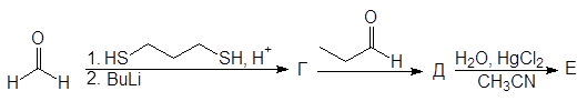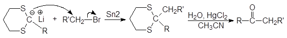 Далее карбанион алкилируется алкилгалогенидом, и после расщепления замещенного тиоацеталя образуется новое карбонильное соединение.